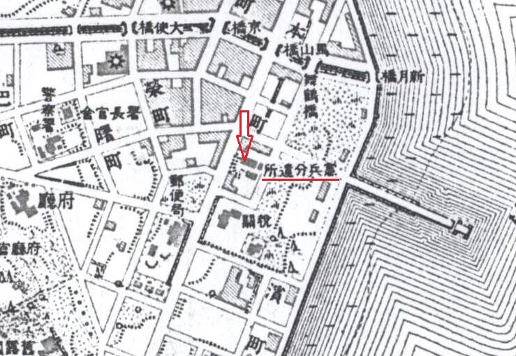 이 지도를 확대(아래 그림)해 보면 '헌병분견소'라고 표기된 건물이 정확히 그려져 있다. 위치도 정확하고 건물의 배치형태도 『조선주차군 영구병영, 관아 및 숙사건축 경과개요』의 ‘마산헌병분대청사및부속건물’에 첨부된 축척 1/300 ‘마산헌병분대배치도’의 도면과 동일하다.
