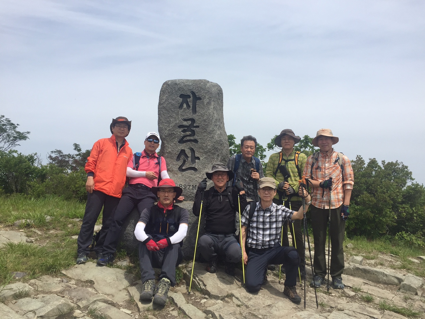 통상 산행 속도는 시간당 2∼2.5킬로를 이동하는데, 쇠목재(베이스, 해발고도 650m)에서 자굴산 정상(897m)까지 약 1.3킬로를 전날 밤의 여파로 1시간 20분 걸려 11시경에 정상을 정복하는 거북이 산행이었다.
