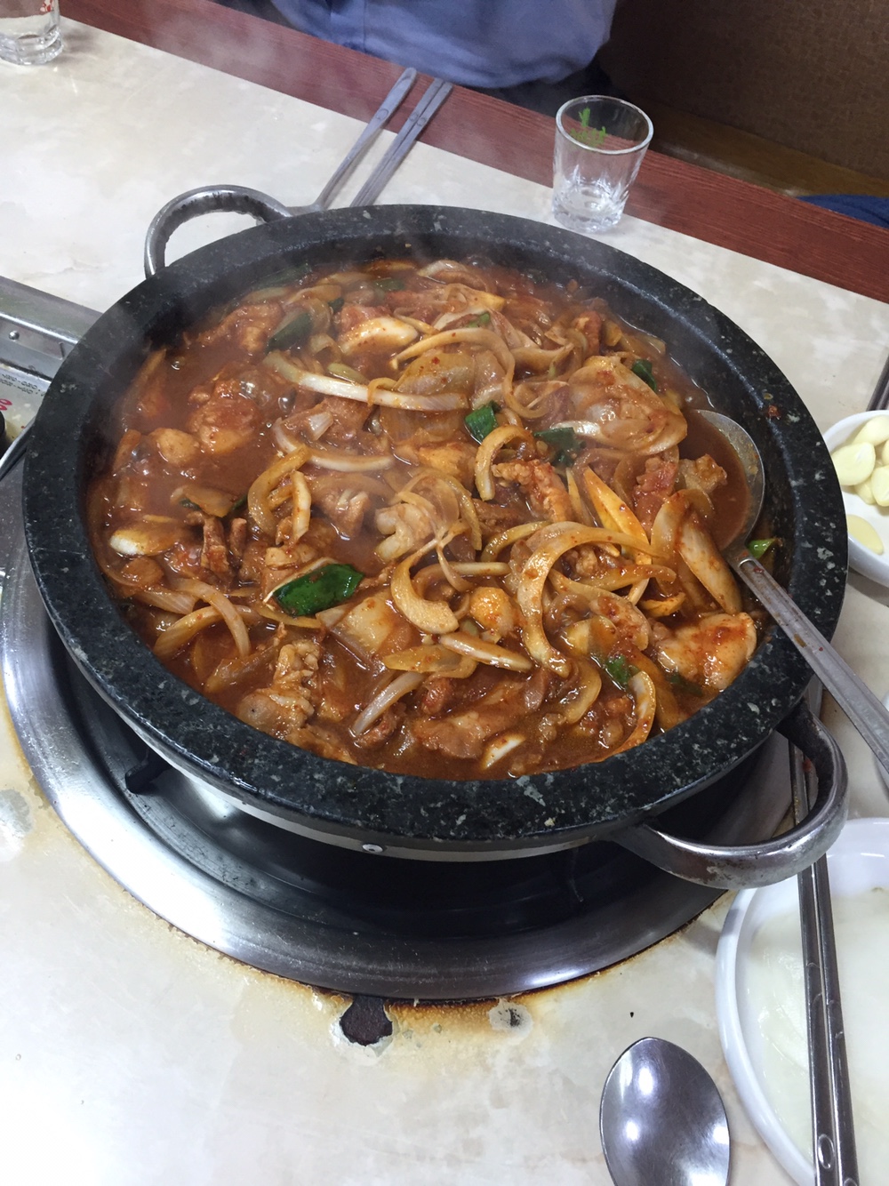 돼지고기 불고기인 것 같은데, 육수를 먼저 끓인 후 돼지고기 주물럭을 넣어 한참 뒤집기를 하니 특색 있는 먹음직스러운 주물럭 두루치기가 완성되었다.