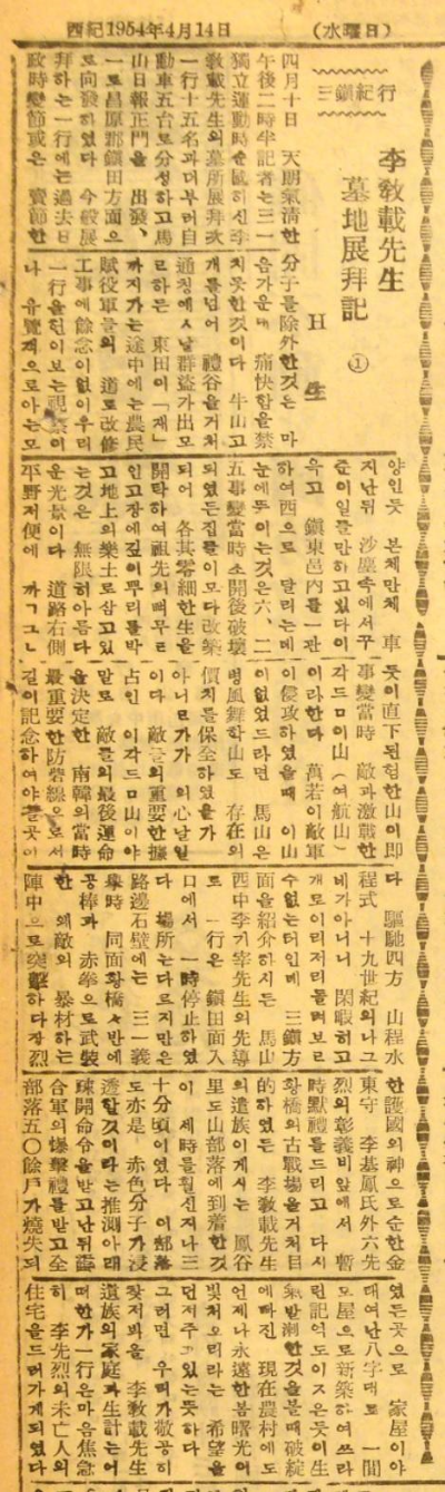 4월 10일 천랑기청(天朗氣淸)한 오후 2시 반, 기자는 3·1 독립운동 시 순국하신 이교재 선생의 묘소 전배차 일행 15명과 더불어 자동차 다섯 대로 분승하고 마산일보 정문을 출발, 일로 창원군 진전 방면으로 향발하였다.