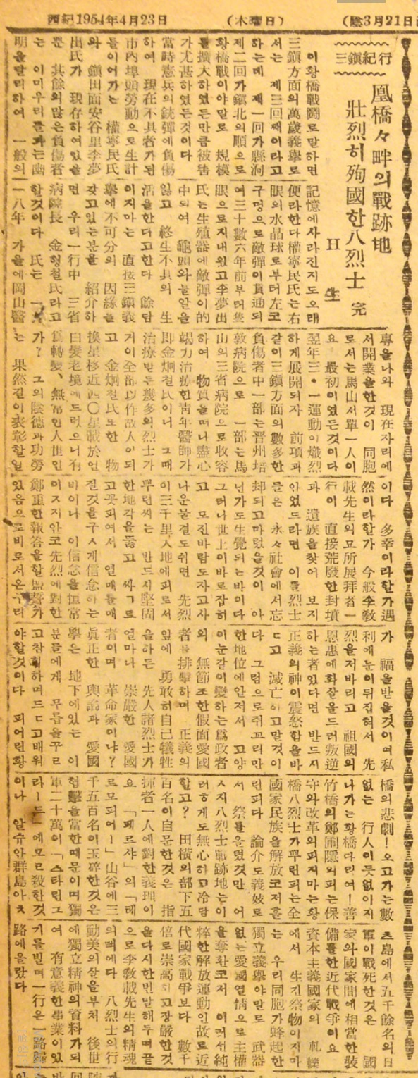 선죽교의 정포은의 피는 보수와 개혁의 피지만 황교 팔열사가 뿌린 피는 전 국가 민족을 해방코저 흘린 피다.