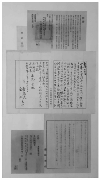<그림 3> 동아대학교박물관에 소장된 이교재임정문서 4건. 성낙문에게 보내는 특발문(상), 조완구·김구발 김관제·윤상태 대조 편지(중), 이시영발 김관제 수신 편지(하우)와 밀양의 황상규에게 보내는 추조문(하좌)