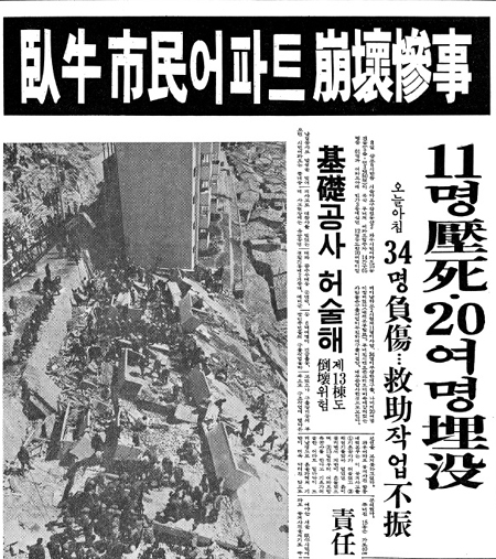 우리나라 부실공사의 원조는 1970년 와우아파트 붕괴사고였다. 낮은 공사비로 6개월 만에 공사를 끝낸 서울 마포구의 5층 아파트 한 동이 준공된 지 넉 달 만에 무참히 주저앉았다.