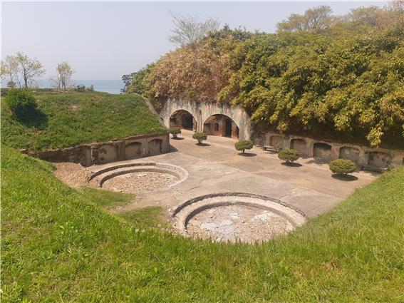 - 포대진지 상부 전경 : 원형이 포신이 놓인 자리이며, 포대 사이 덮여진 곳이 탄약고 이며, 건너편 아치창호가 설치된 곳이 막사입니다.