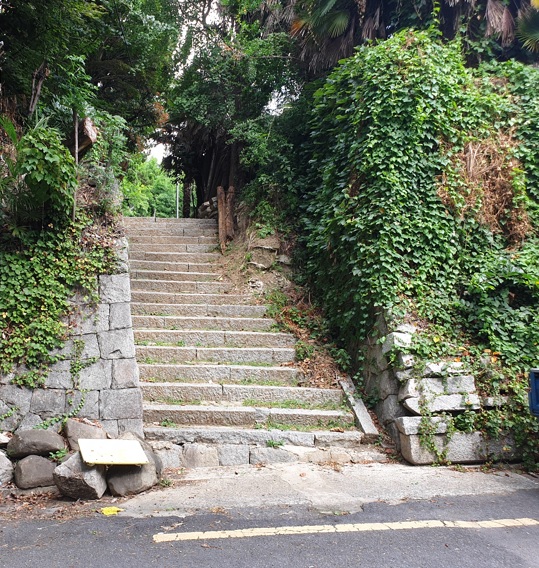 4) 경사지를 극복하기 위해 건축한 석축 옹벽 및 돌계단과 세월을 말해주는 가이즈카(カイヅカ) 향나무가 잔존하고 있다.
