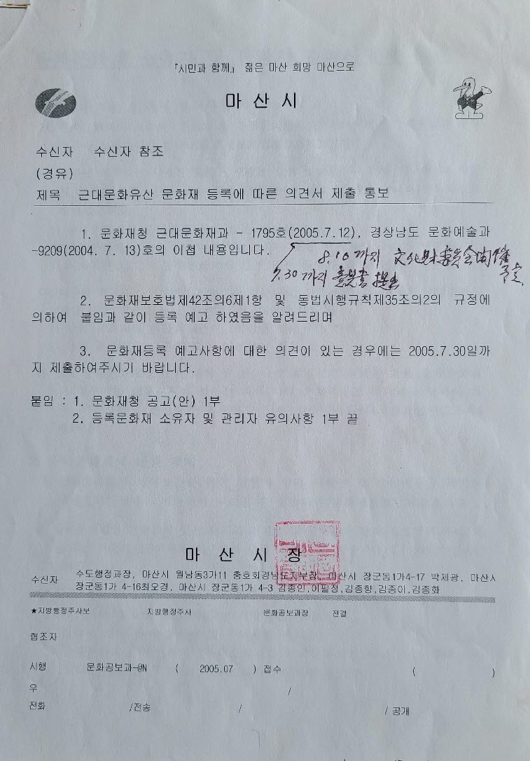 이때 문화재청이 등록 예고한 경남 24개소(진해 11, 마산 3, 밀양 3, 거창 2, 창원·통영·남해·진주·산청 각 1개소) 중 유독 본 건물만 건축주의 반대로 등록되지 않았다.