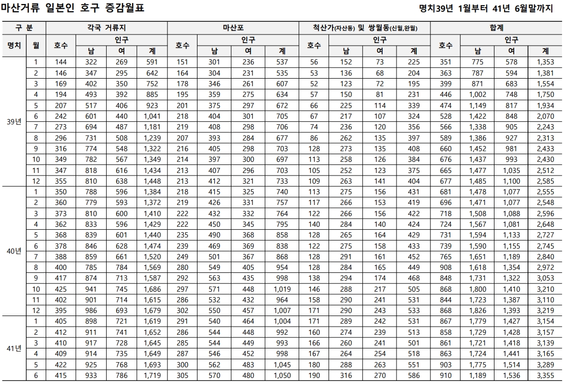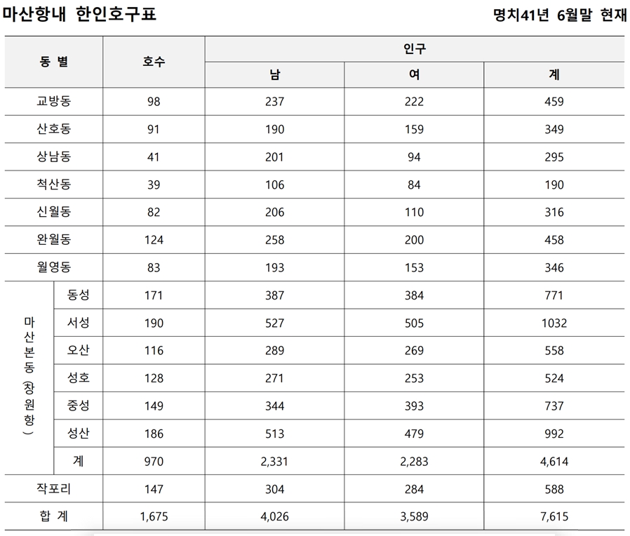 1905년 4월의 호수는 겨우 340호, 인구는 1,248명이며 그중 남자가 717명, 여자가 531명이다. 1906년 1월 이후의 증감표는 다음과 같다. 작포리(鵲浦里)는 중포병영의 사격장으로 제공되기 때문에 한인들은 현재 퇴거 중이다 얼마 안 가서 이전하고 나면 호구는 아예 없을 것이다. 또한 월영동의 일부도 병사 건축을 위해 퇴거 중이라 호구 수에 큰 변동이 있을 것이다.