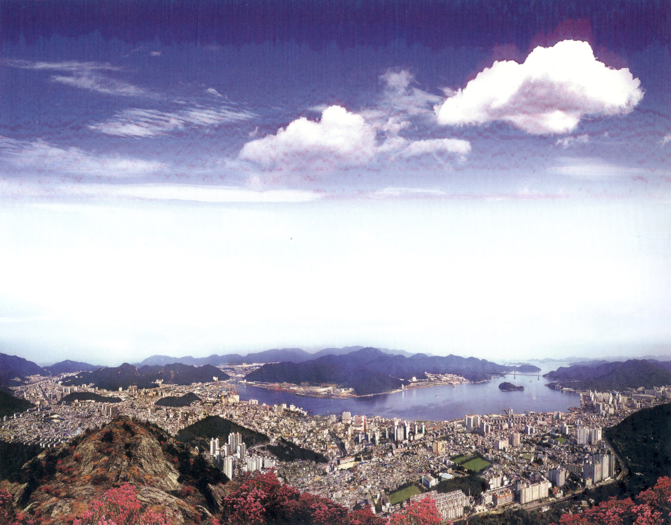 동북안으로는 반룡산(盤龍山)의 연이은 고개들이 우뚝 솟았다. 서남안으로는 정령(丁寧), 청량(淸凉), 자복(滋福), 율전현(栗田峴) 등의 산들이 솟았다 앉았다 하고 있으며 동쪽의 맞은 편 해안으로는 진해와 웅남 두 면(面)의 산들이 푸른 그림자를 거울 같은 바다 표면에 드리우고 있다.