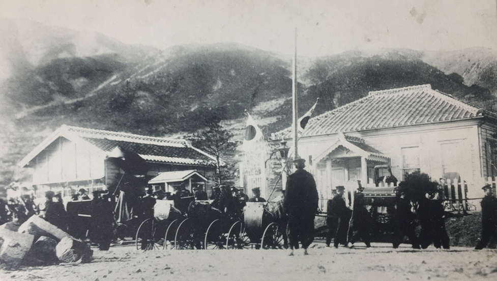 특히 폐하가 지나가실 각국거류지 대로변의 모든 집들은 양국기를 그린 천막으로 점포를 가리고 마산역 서쪽 매립지에는 불꽃을 쏘아 올리게 터를 잡았다. 행재소인 이사청 청사 및 이토 통감의 숙소인 언덕 위의 이사관 관저에는 빠짐없이 장식을 걸어놓고 어가의 도착을 기다린 것이다.