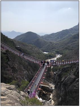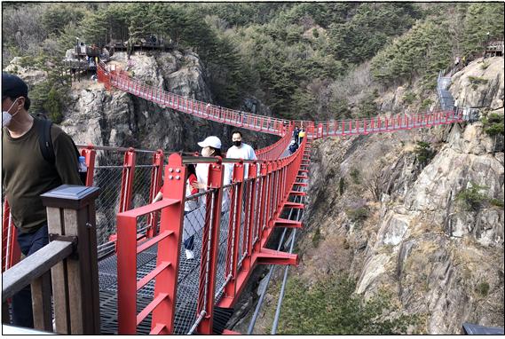 산행을 출발하여 4시간 30분 정도 흐른 시간이다. 마장재를 출발하여 30분 정도 하산 발걸음을 거듭하여 Y자형 출렁다리에 도착하니 3시 20분경이다. 관광객이 꽤 많이 와 출렁다리를 거닐며 스릴을 느끼고 있었다.
