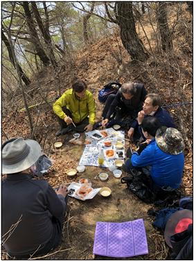 이제 정상도 정복했으니 하산을 위한 체력을 보강하고 산에서의 점심 그 맛을 즐기기 위해 터를 잡아 충무김밥과 금정산 막걸리로 등에 붙은 배를 채웠다.
