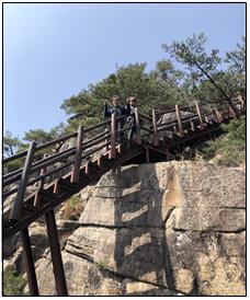 점심 뒷자리를 말끔히 정리하고 휴식과 막걸리로 인해 풀린 다리를 이끌며 또 오르락 내리락하는 산길을 거닐며 기암괴석과 먼 풍경을 눈에 하며 Y자형 출렁다리와 2명의 대원이 기다리는 항노화 힐링랜드를 향해 발길을 제촉했다.