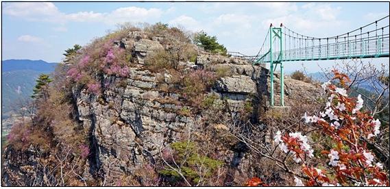 적석산은 해발 500m도 되지 않는 근교산(497m)이지만, 정상부분에 시루떡같이 바위가 층층이 쌓여 있는 산세에다(사진3) 구름(출렁)다리가 있어 인근 도시민들이 나름 많이 찾고 있는 지역의 산이기도 하다(사진1).