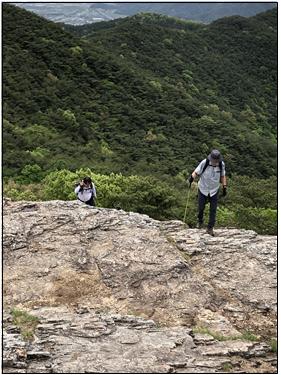 11시 35분경 정상을 출발하여 잠깐의 하산길에 구름다리에 이르니 반대편에서 오는 등산객(여성)을 마주쳐 일행의 사진을 찍어 달라 부탁하고 찍어주고 곧장 하산의 발걸음을 제촉하면서도 일행은 지나친 두 여인을 잠시 하산길의 이야기꺼리로 삼기도 했다.