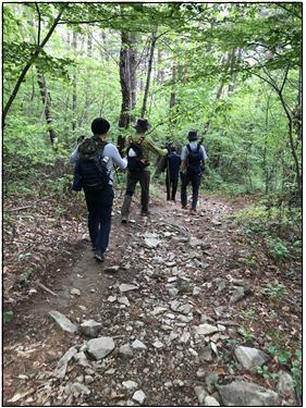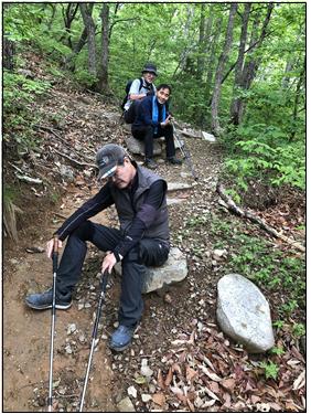 반시계 방향의 산행거리는 시계방향보다는 상대적으로 길지만 완만한 경사인 반면, 시계방향은 정상까지 거의 직선으로 오르는 길이기 때문에 경가가 상대적으로 급하다. 때문에 경사가 급한 코스로 하산하는 것은 오히려 무릅과 발목에 무리가 갈 수 있기 때문에 시계방향으로 순환하는 코스를 잡고 페이스 메이커(서익진)를 앞세워 슬렁슬렁 오르기 시작했다.