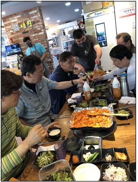 3대의 차량에 분승하여 삽겹살이나 주물럭 식당을 찾아 진전면 대정마을로 이동하여 식당에 들러 다리와 허리를 쉬게 하며 맛나는 주몰럭으로 산행의 대미를 장식한 후, 잠시 차를 몰고 찻집에 들러 고기 식사후 커피 코스로 뱃속을 달래는 시간을 가졌다.