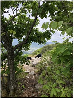 까마귀도 아는 듯 반복적 학습효과로 간식을 먹는 우리 머리 위와 주변 나무를 맴돌며 먹이를 기웃거리고, 야생인지 방목인지 모르겠으나 흑염소도 사람을 아랑곳하지 않고 주변을 왔다갔다 하는 또다른 상황을 목격했다.