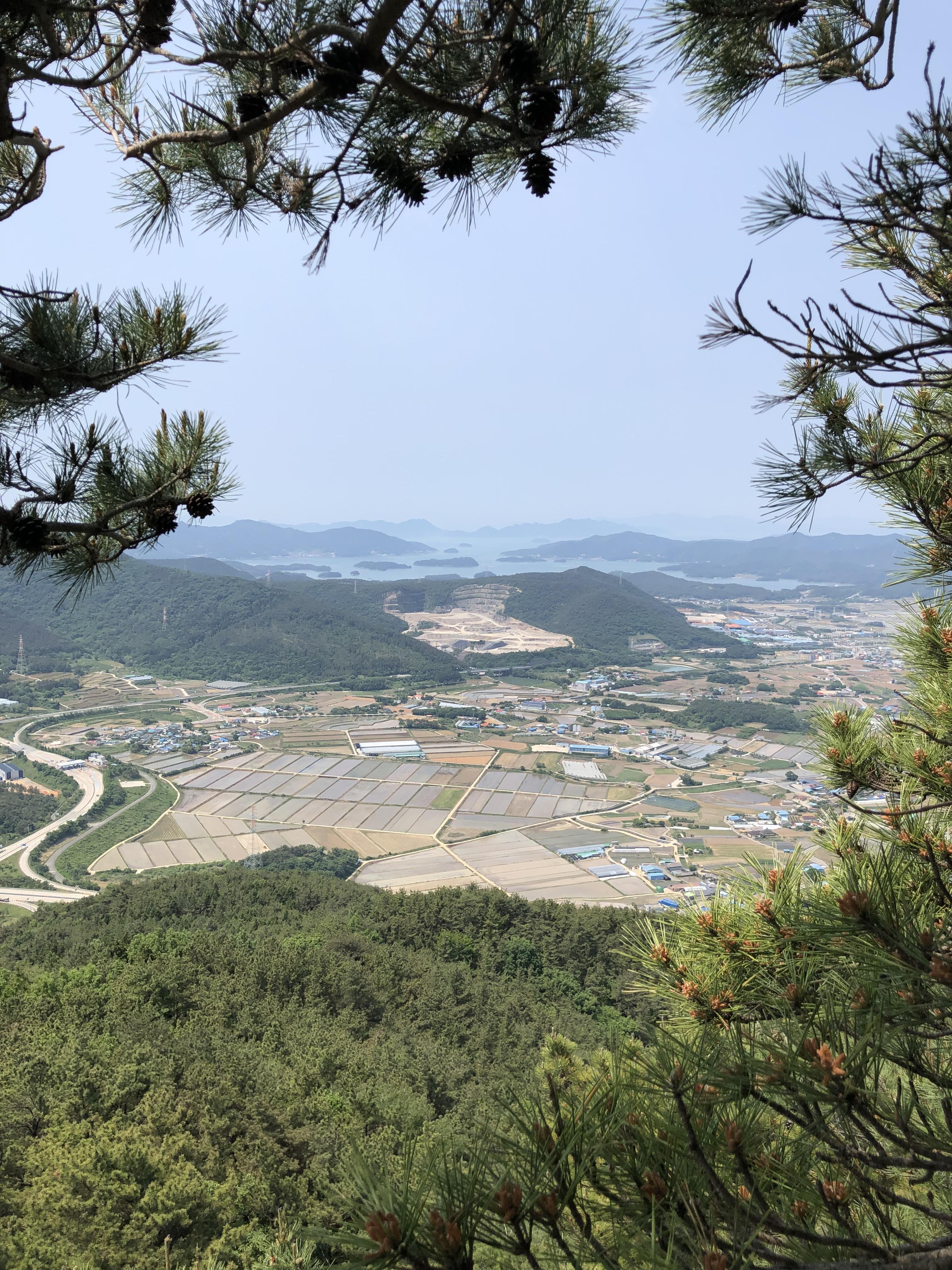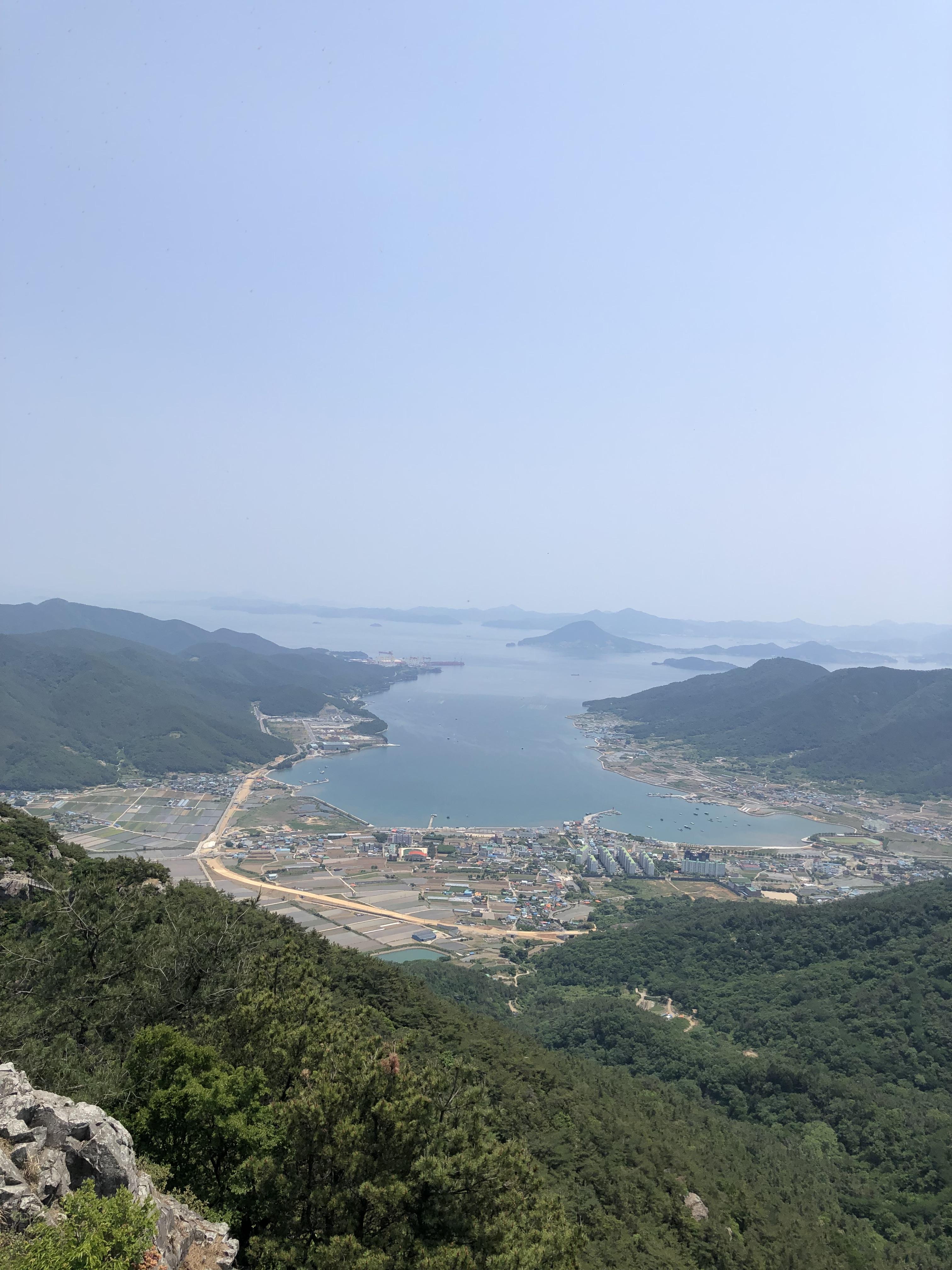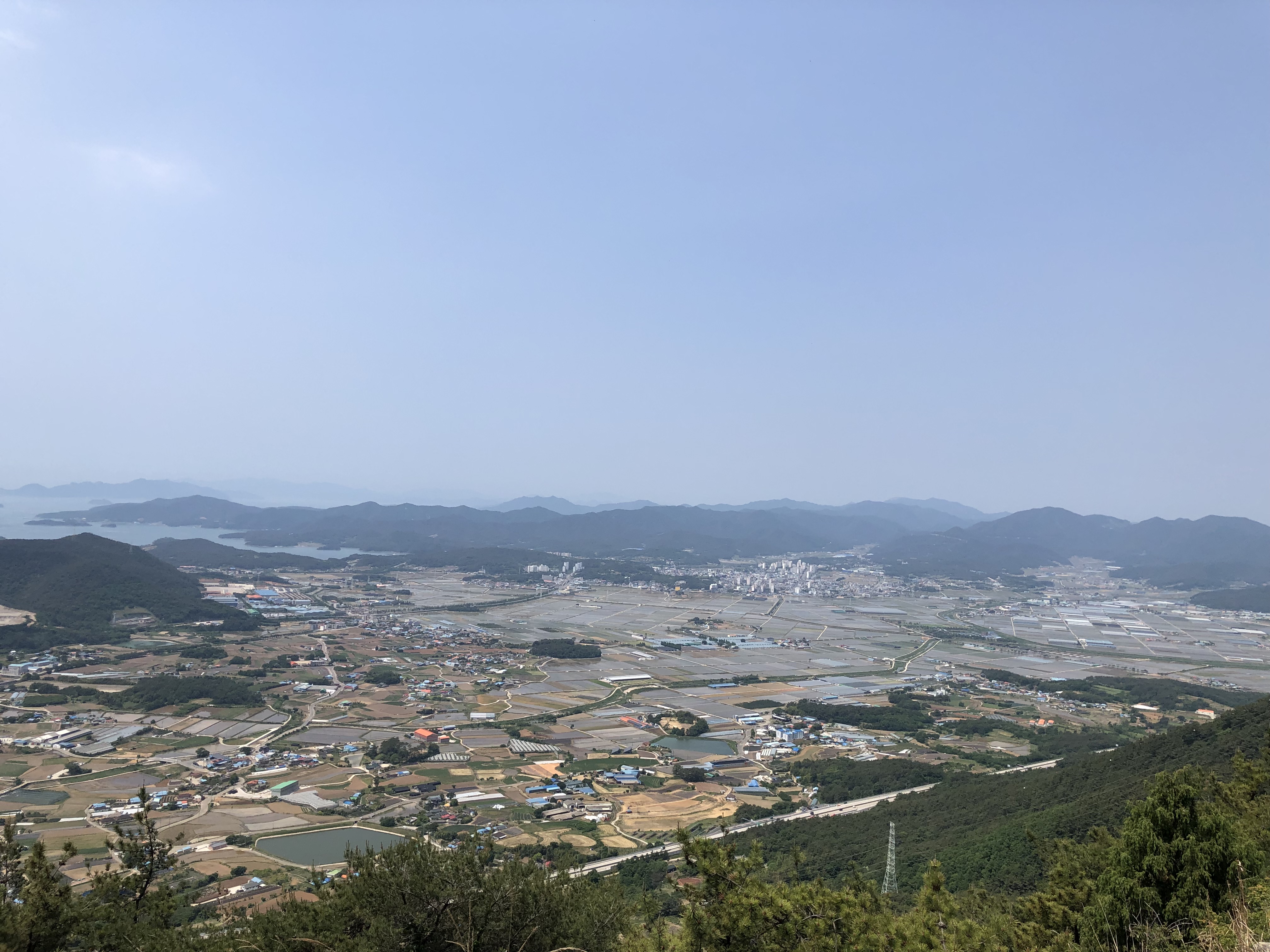 문암산에 오르면 왼쪽은 고성 들판(아래 사진-상)과 시가지(아래 사진-중)가, 오른쪽으로는 한반도(남한) 형상을 한 당동만(아래 사진-하)이 한눈에 들어와 그 순간 땀과 목까지 차오르는 가픈 숨을 몰아쉬며 가파른 산길을 오르는 그 쾌감을 느끼게 한다.