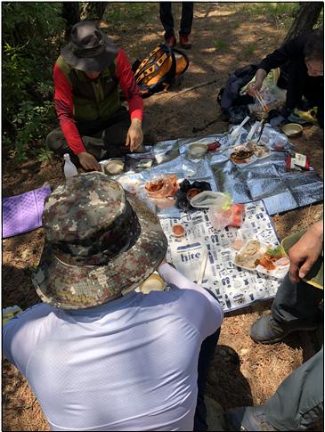 잠시 정상의 정복에 족적을 남기고(아래 사진-상) 하산을 제촉하여 산을 오르는 도중에 만난 고성군민의 안내에 따라 거북바위 방향으로 발길을 옮겨 그늘과 평지를 찾아 소진된 에너지를 보충하기 위해 점심을 할 자리를 찾아 짐을 풀고 산행하면서 항상 기다려지는 시간을 가졌다(아래 사진-하).