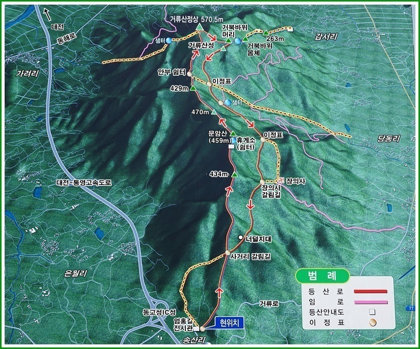 마침 고성군민으로서 거류산 인근에 산다는 주민을 만나 정상에 오르는 길과 하산을 위한 코스를 소개받게 되었다(거류산 정상~거북바위~장의사). 올라왔던 길로 다시 하산을 하게 되면 무릅에 무리가 가기 때문에 코스는 좀 더 길지만 소개받은 길을 따라 가면 훨씬 편하게 하산할 수 있다는 것이었다.