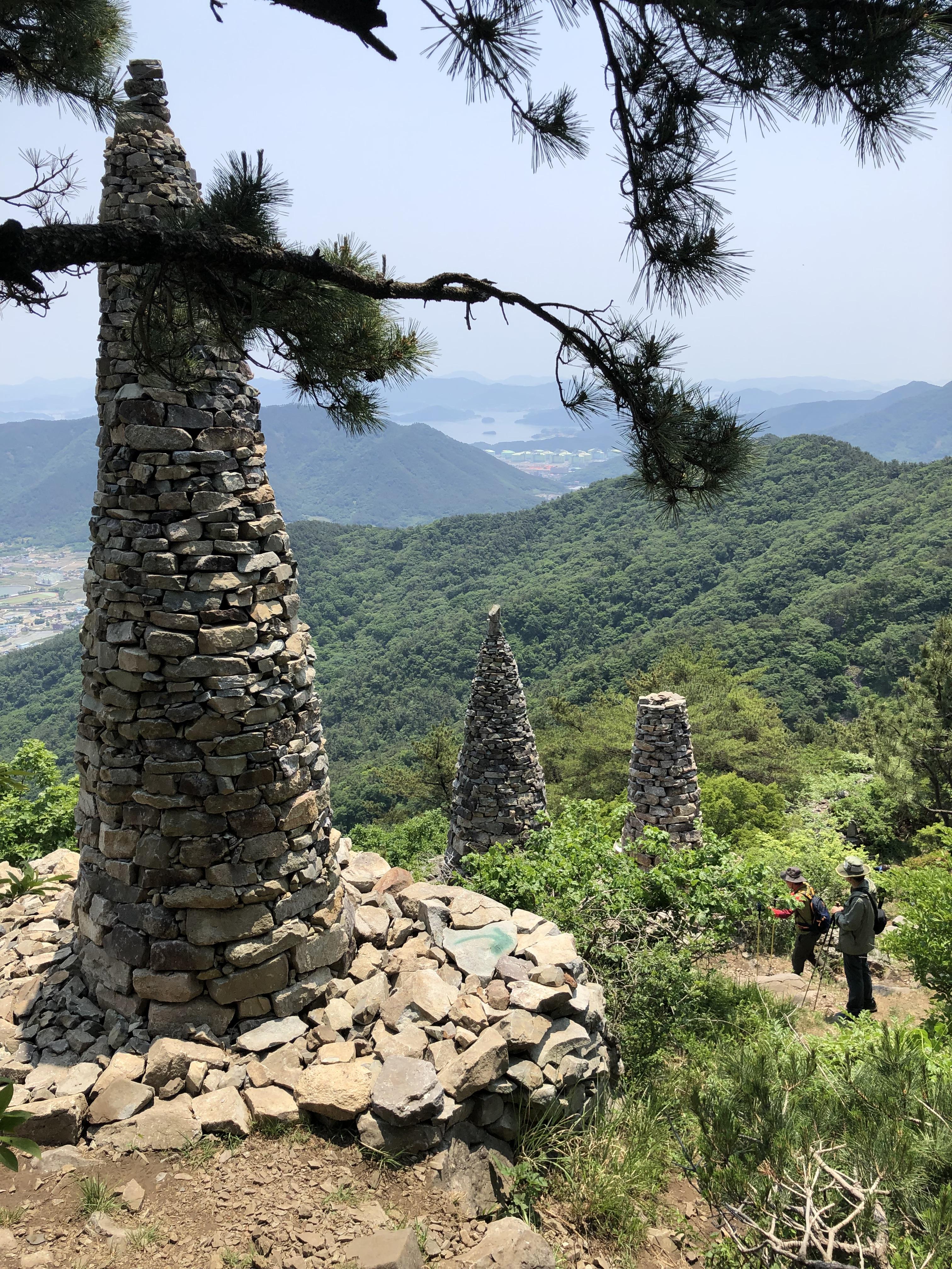 잠시 걸음을 제촉하니 거류산성이 나타났고(위 사진-중), 그 산성 인근에 누군가가 거류산에 오는 등산객에게 볼거리를 제공하기 위해 꽤 석공의 경험이 있는 듯한 실력으로 돌탑을 쌓아 두었고(위 사진-하), 쉬엄쉬엄 계속 작업을 하려는 듯 장비(사다리)도 곁에 있었다.