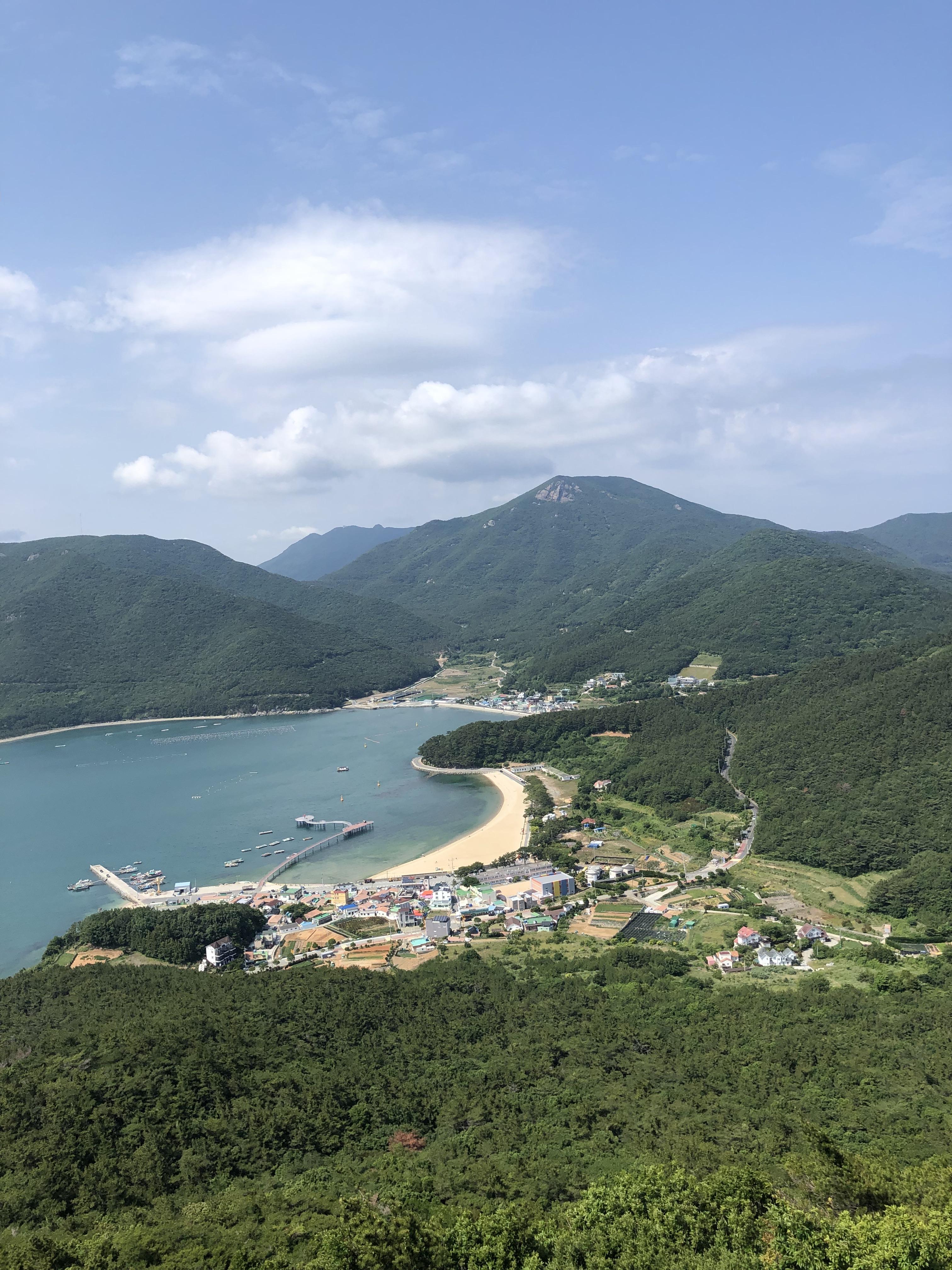 20분 정도 가파른 경사를 타고 산을 오르니 첫 산봉우리 각지미봉에 도착할 수 있었다. 발 아래를 내려다 보니 다대항과 다포항 그리고 멀리 해금강의 해안 절벽이 한눈에 들어온다.