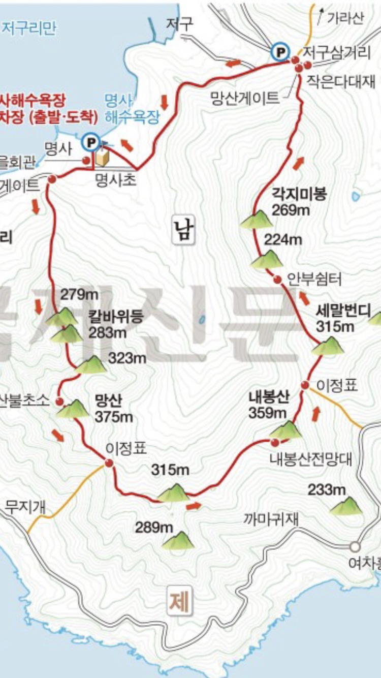 오늘의 망산 등산코스는 “저구삼거리 주차장~각지미봉~세말번디~내봉산~망산~칼바위등” 으로 이어지는, 즉 아래 그림의 화살표와는 반대 방향인 시계방향으로 순환코스를 잡았다.