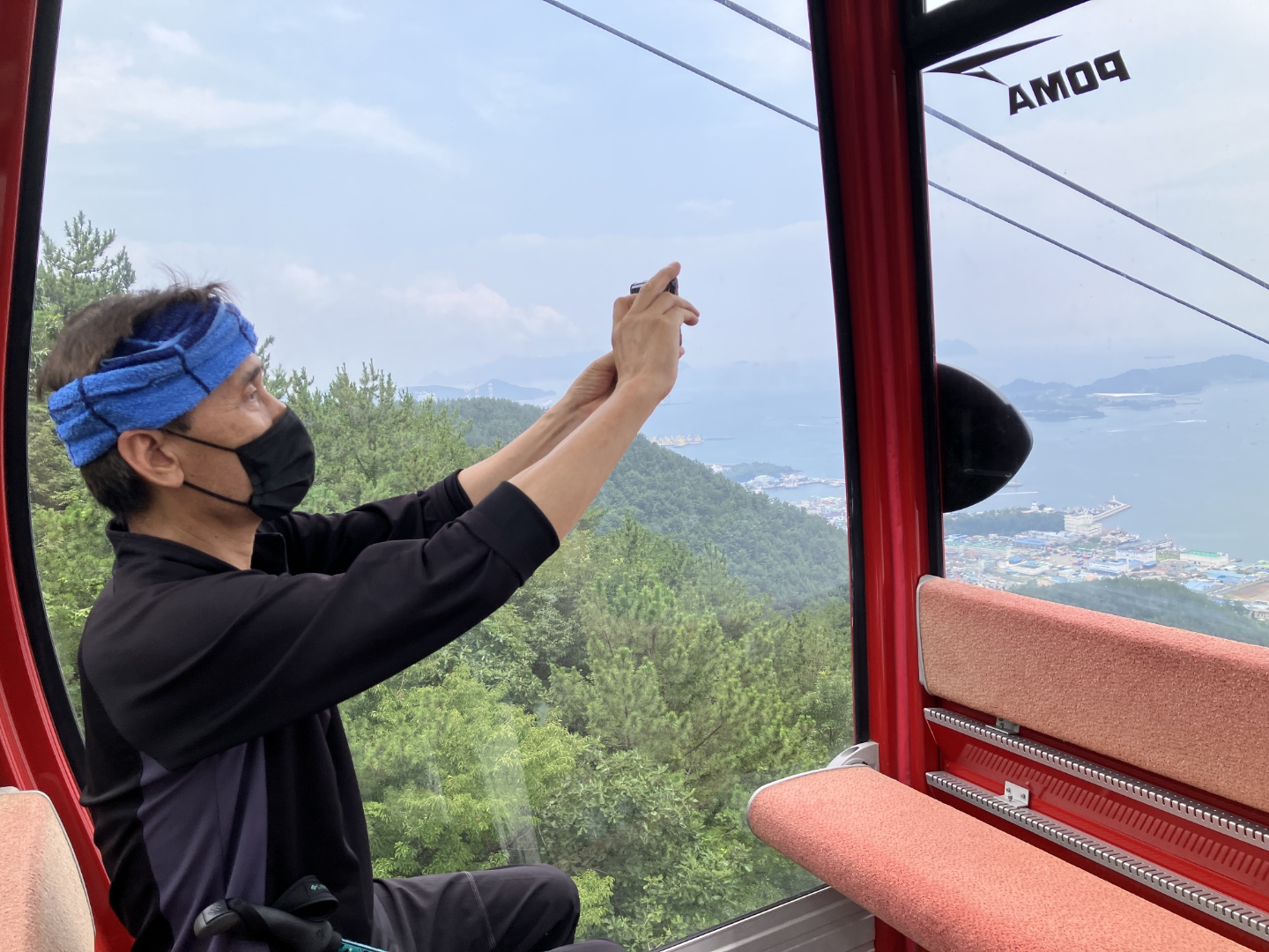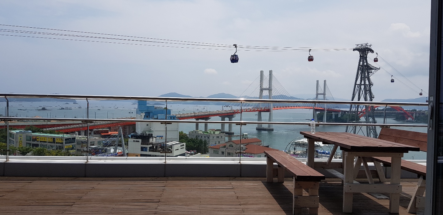 휴식을 잠시 하는 사이 먼 바다를 바라보니 파란 바다 빛이 넘 좋다. 휴식처 바로 옆에서는 케이블카가 오고 가는 소리가 끼익 끼익 들린다.