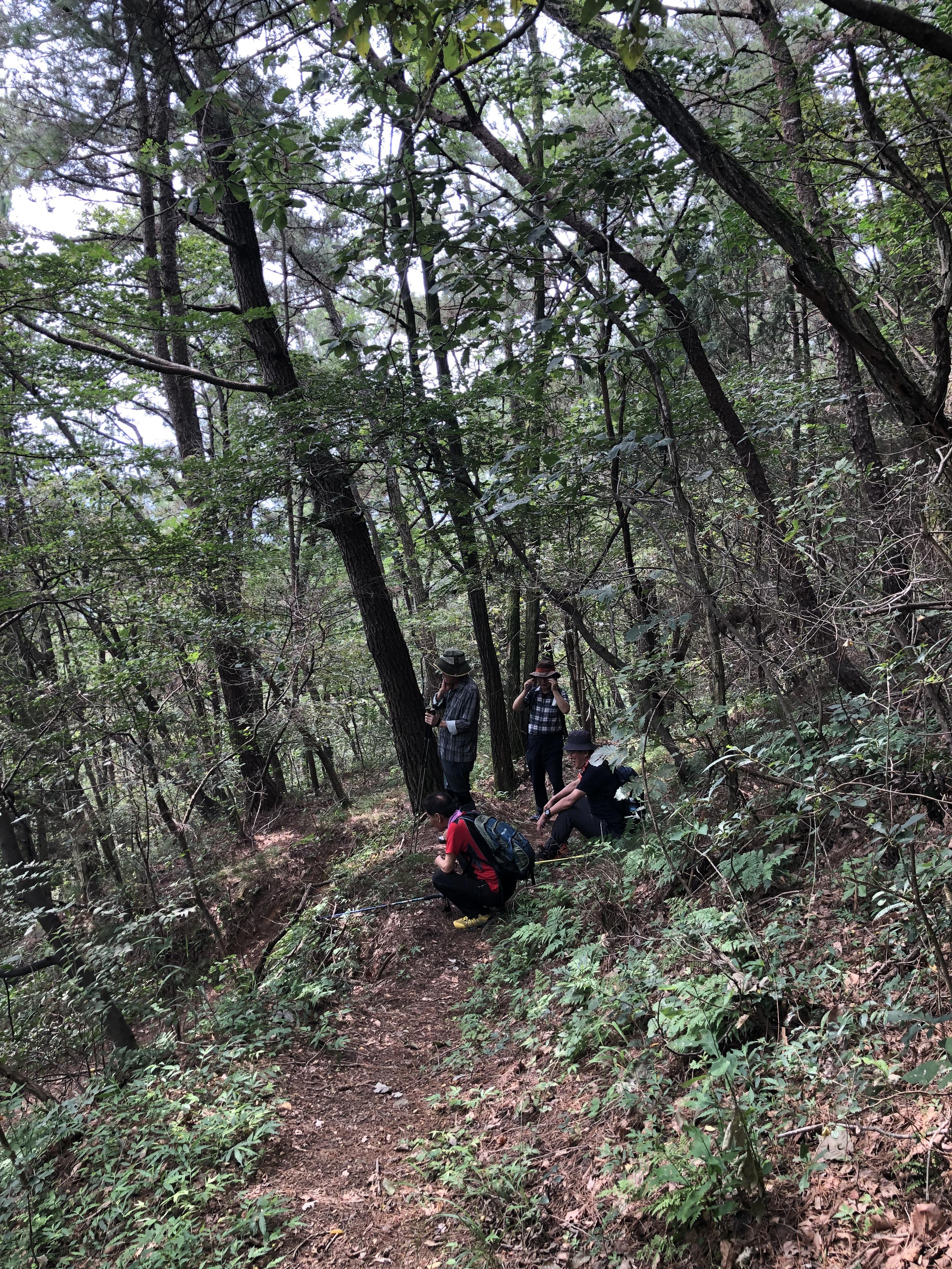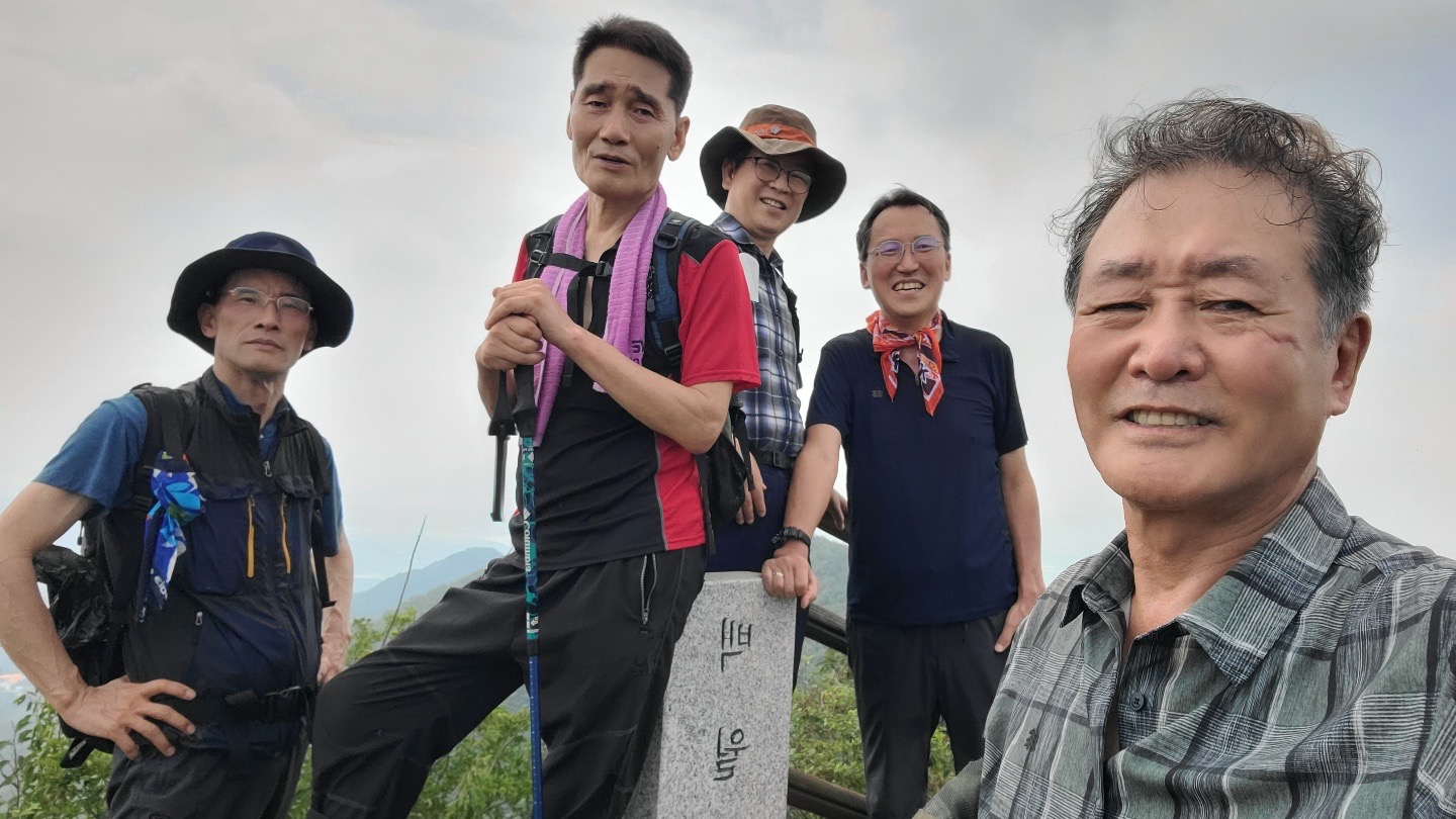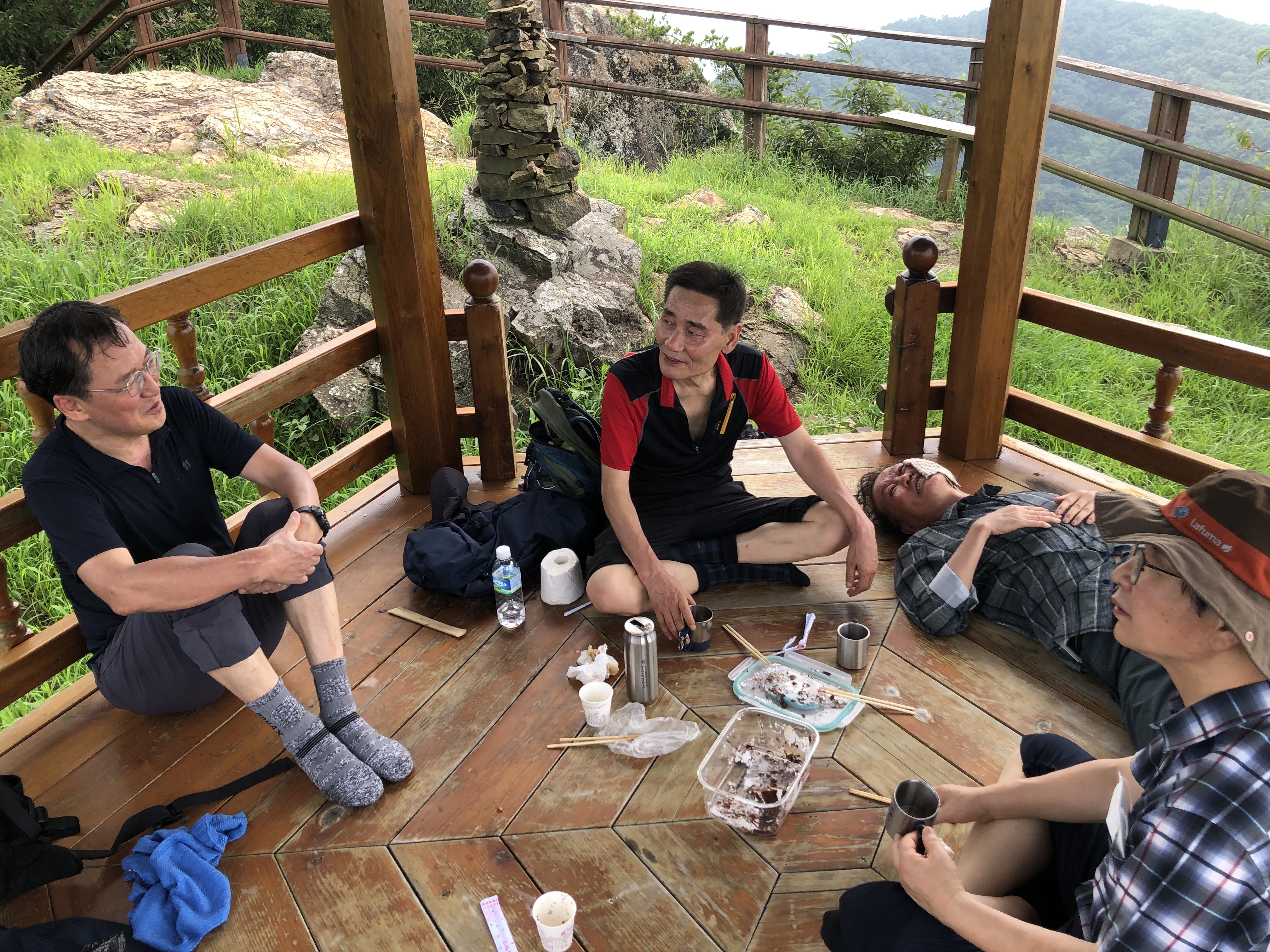 정상(428m) 전의 한 봉우리에는 정자를 만들어 놓았다. 대원들은 무더운 날씨에 허리를 펴기 위해 배낭을 풀어놓고 잠시의 휴식을 취했다. 처음으로 산 정상에서 달달한 스테미나 케익을 먹으며 환담을 했다.