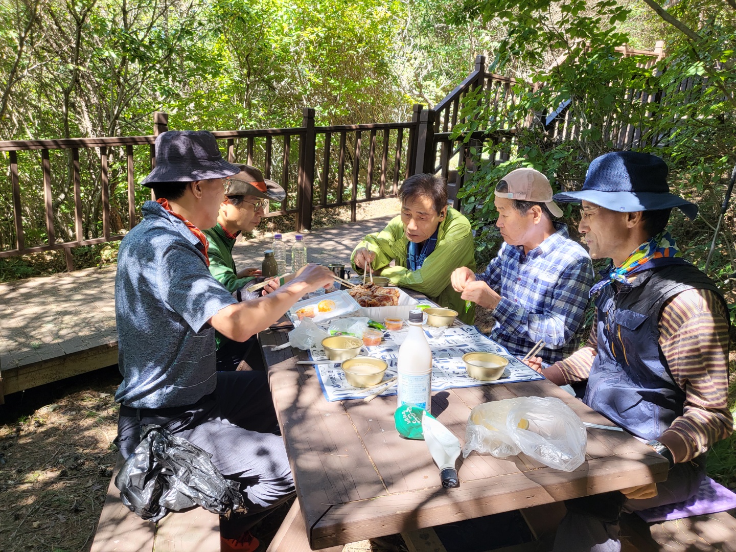 이쯤 해서 1시간반 정도 결려 정상에 왔으니 점심시간이 되었다. 이제 약간의 허기를 달래며 휴식을 취하기 위해 점심을 할 수 있는 자리를 찾으며 하산길 방향(동봉방향)으로 발길을 옮겼다. 조금 걸어도 마땅한 자리가 보이지 않았지만, 조금 내려가자 등산길 옆에 설치된 나무탁자를 발견하고 우리 일행은 배낭을 풀었다.