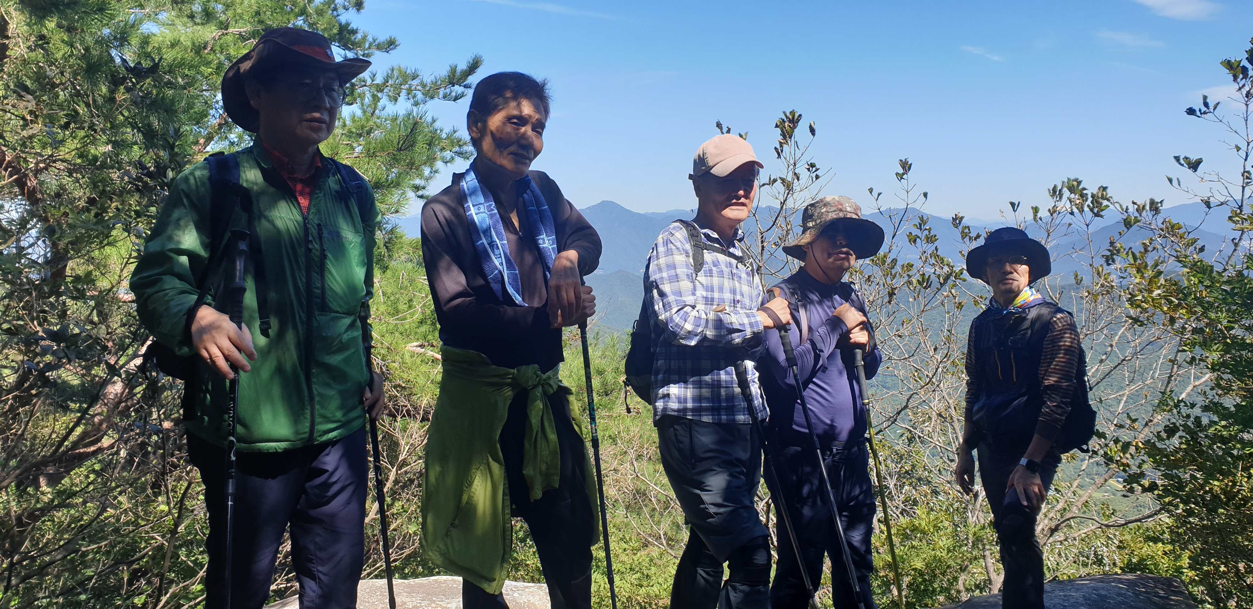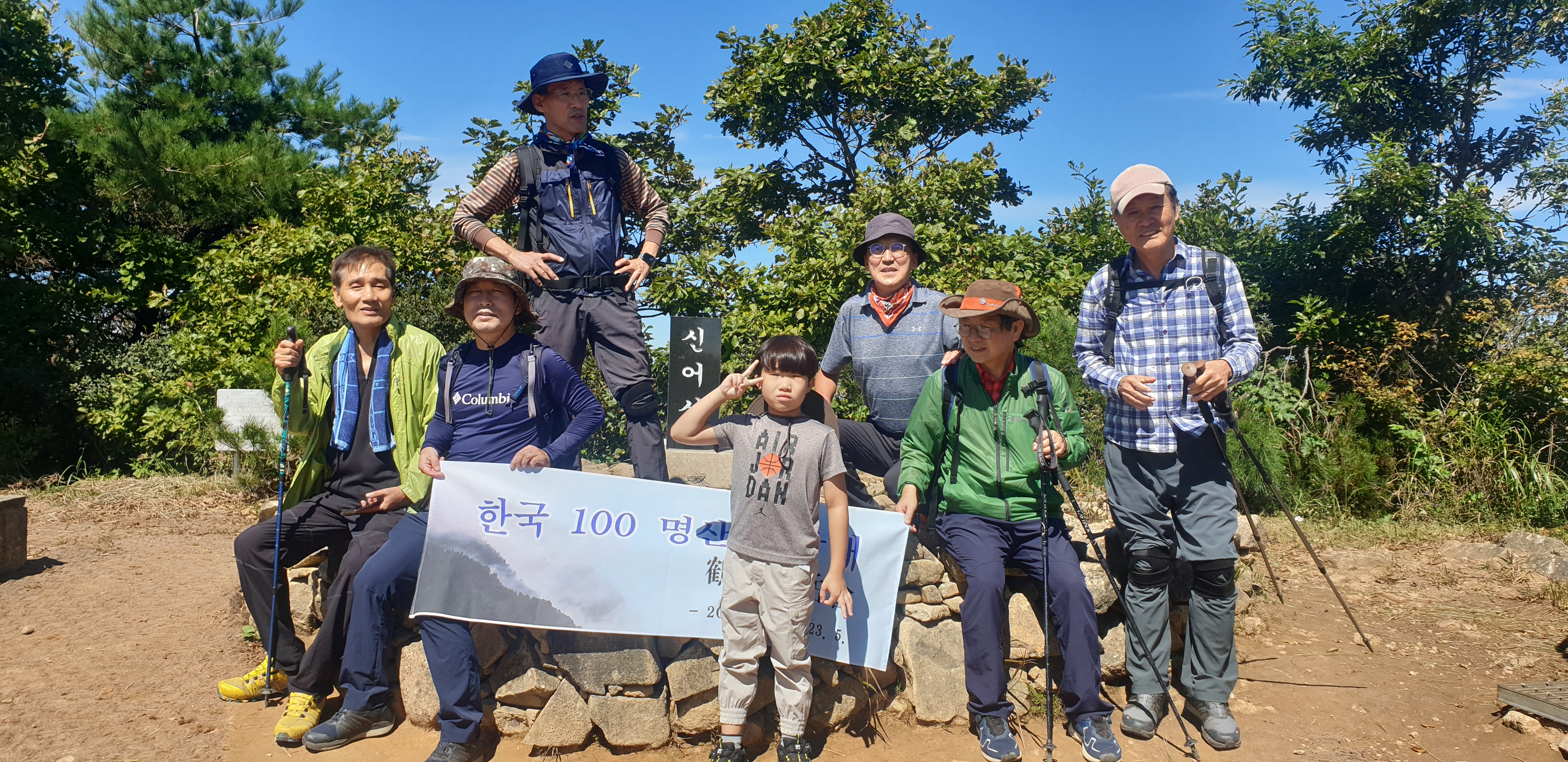 정상에 오른 증거를 남기 위해 단체사진 몇 컷을 찍었다. 새로운 것은 10년 전에 만든 산악회 플랭카드가 행방불명되어 새로 제작한 플랭카드를 단체사진의 사진 속에 남겼다.