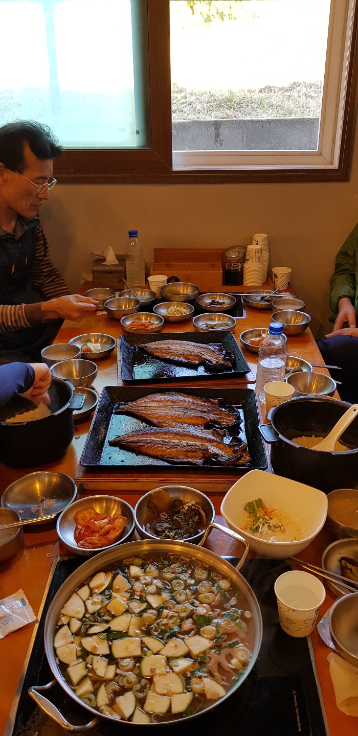 공기밥이 아닌 밥솥 채로 나오기에 우리가 직접 밥을 퍼서 1인당 반마리의 450℃에 구운 고등어를 메인으로 특식으로 대미를 장식했다.