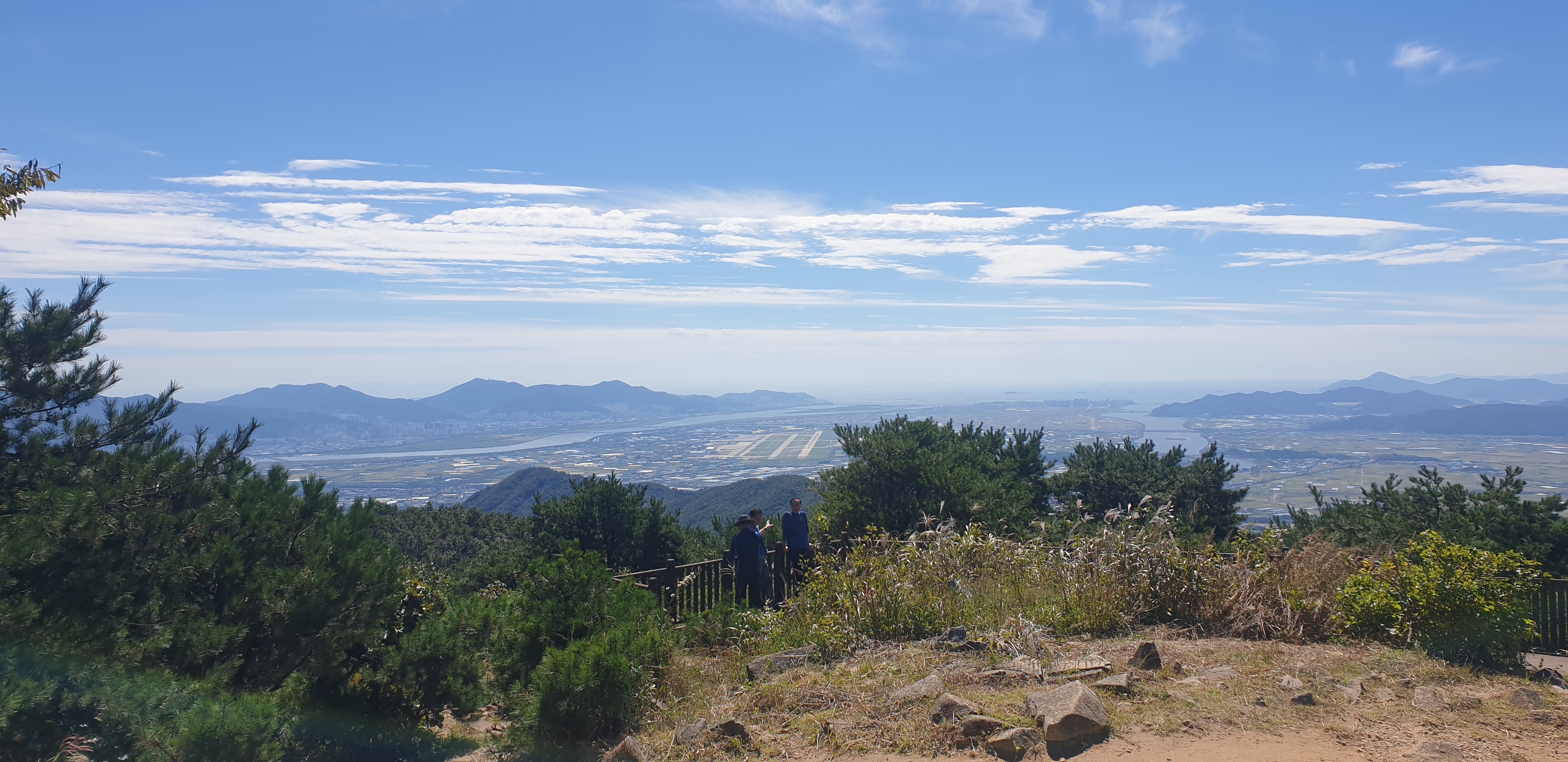 정상에서 시야가 트인 곳으로 눈을 돌리니 김해공항 활주로와 낙동강 본류와 서낙동강 그리고 김해평야가 한 눈에 들어왔다, 일행은 역시 신어산은 김해의 진산이구나 하는 정상에 오른 감동을 중얼이기도 했다.
