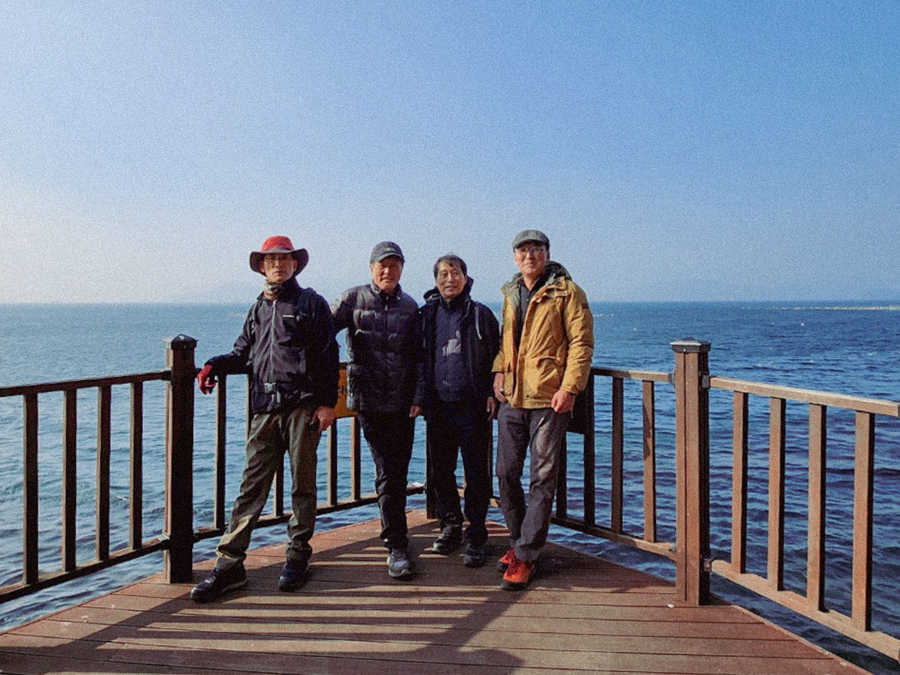 잠시 숨을 고르고, 반환점으로 내려오니 원로님들은 먼저 떠나고 없었습니다. 급경사길을 한참 내려오다 보니, 원로님들을 따라잡을 수 있었습니다. 조금 지나니 4데크 휴게소에 도착하였습니다. 가져온 커피와 귤로 목을 축였습니다. 그리고 인증샷과 함께 바다를 조망하였습니다.