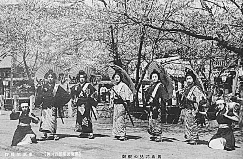 이어 건배를 하고 각자 잔을 주고 받을 때 나루토(鳴戶), 로하의 집(露破の家), 모치즈키(望月), 아즈마(吾妻) 등의 요정에서 온 에기들은 사노사부시(さのさ節, 1897년경부터 유행한 속요. 곡명은 하야시고노바(囃子詞)의 사노사(さのさ)에서 유래)란 손춤을 보여주고 술을 따라주기도 했다.