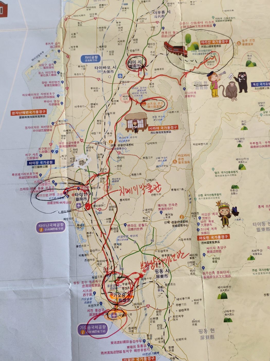 *대만은 면적이 36,197평방킬로미터로 남한(100,210)의 약 3분의 1 정도 크기이고 인구는 2357만(2020)이다. 우리의 전체 여정을 지도에 표시해 올립니다.<<<