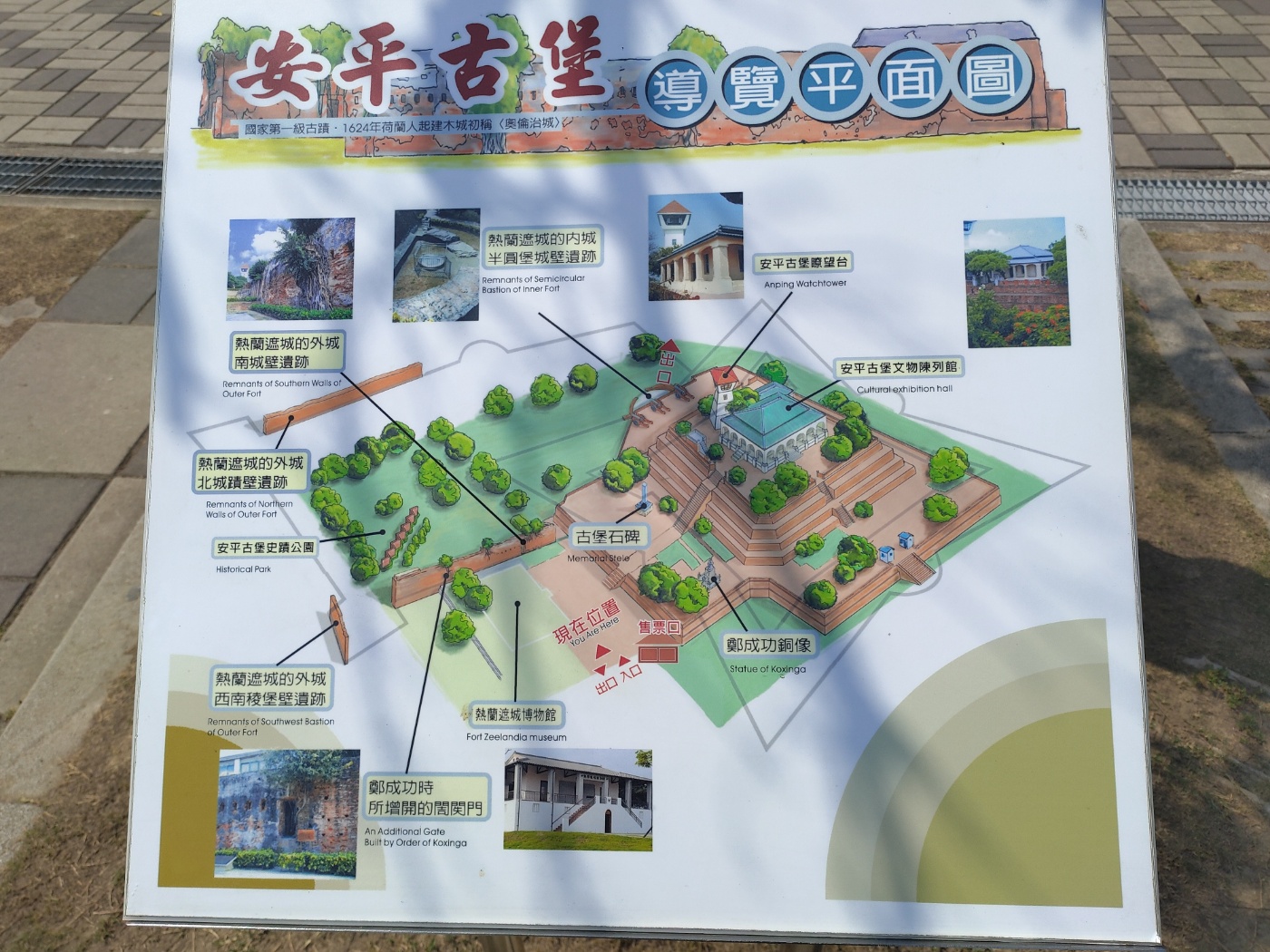 안평수옥에서 잠시 쉬다가 큰길을 건너 안평고보(安平古堡)로 간다. 안평고보는 1625년 네덜란드 동인도 회사에서 건립한 성이자 요새로 네덜란드는 이곳을 명나라, 일본, 동남아시아와의 무역거점으로 삼았다. 붉은 지붕의 전망대에 오르니 안평지역 전체가 잘 보이고 바람도 시원하다. 전망대 오른쪽으로 ‘민족영웅 정성공’이라고 쓰인 동상이 있고. 성(대만성)의 일부도 잘 남아있다.
