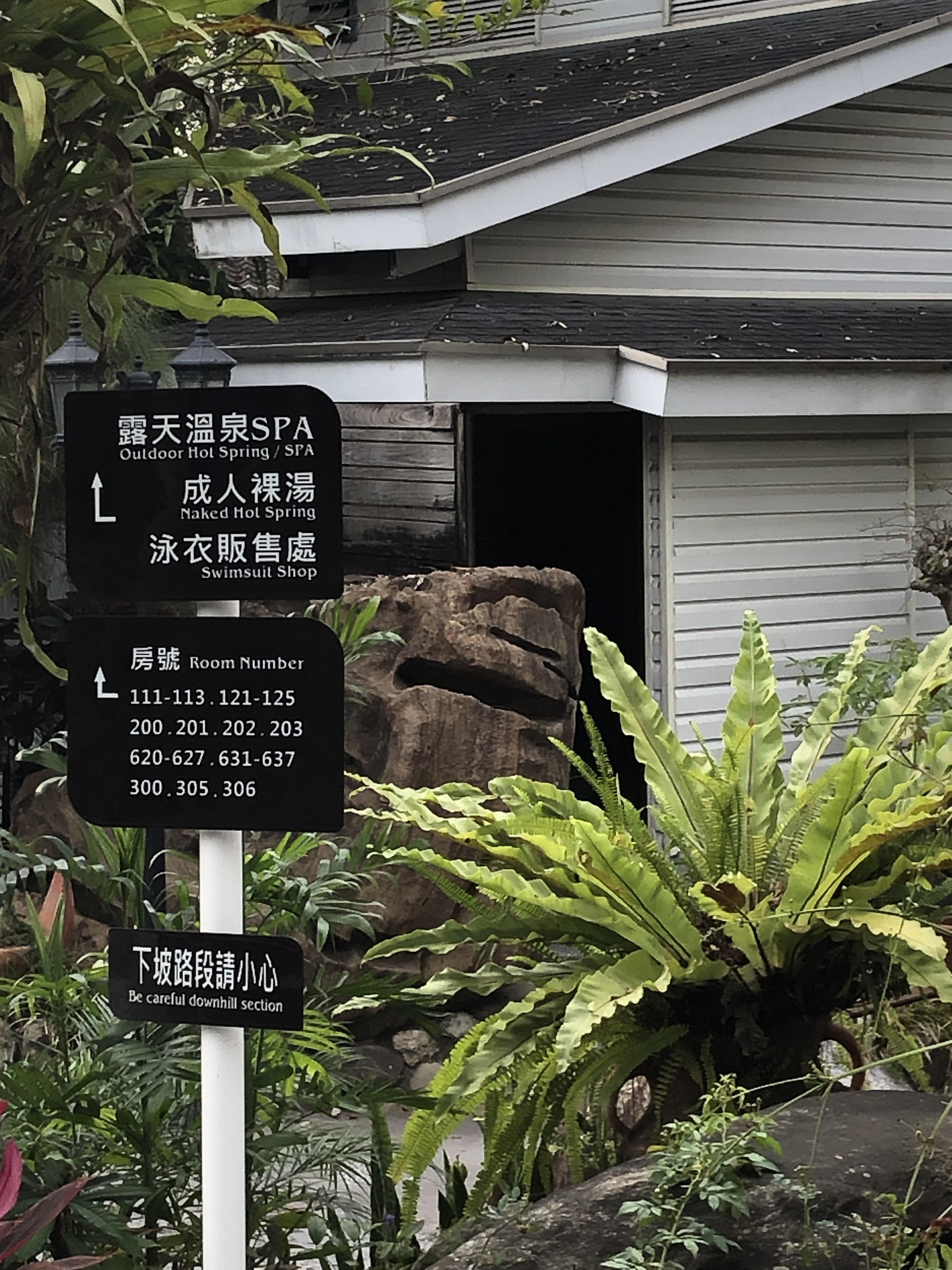 2시 반 경 타이난시 북동쪽, 자이(嘉義)시 동남쪽에 있는 관쯔링(關子領) 온천으로 출발. 시내를 거쳐 3번 고속도로로 달리다가 바이허(白河) 인터체인지에서 빠져 산속으로 들어간다. 아열대 산의 풍성한 삼림이 멋지다. 관쯔링(關子領)온천은 대만의 4대 온천 중 하나로 머드온천으로 유명하다. 차로 산을 한참 올라가 경대산장(景大渡假莊園)에 도착했다. 우리 일행은 수영복이 없어 아쉽게도 남녀공용노천수영장(山泉露天遊泳池)으로 못가고 남성전용나체욕탕으로 들어간다. 산 속에 있는 아담한 크기의 온천에 몸도 담그고, 욕탕에 딸린 야외 휴식공간에서 시원한 바람과 함께 멋진 경관을 감상하며 기분좋은 시간을 보냈다.