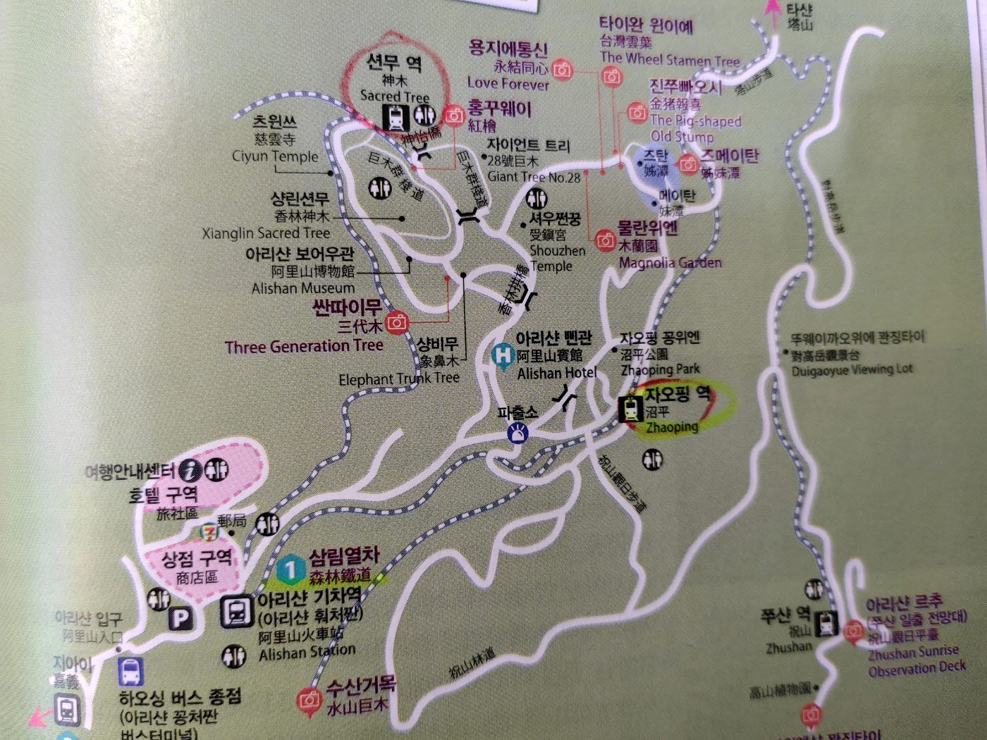 9시 정각 아리산역(2190m)에서 아담한 크기와 길이의 빨간색 협궤기차를 타고 오른쪽 자오핑(沼平,2274m)역까지 간다. 쟈오핑역은 1914년에 완공된 역으로 개통 당시에는 아리산 본선의 종착역이었다. 7분의 짧은 시간이지만 숲속을 달리는 삼림 열차의 맛을 느낀다. 아리산각 호텔 앞으로 난 철로를 따라 조금 걷다가 아래쪽 하이킹 코스(쟈오핑역에서 션무역까지)로 접어든다.