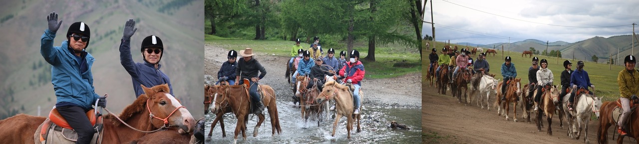 더운 날씨에 사원 관람을 마치고 나와 아이스크림을 함께 먹으니 맛도 있고 재미도 있다. 이제 20분 정도 차로 가, 몽골 여행에서 빠질 수 없는 말타기 체험을 한다. 승마장은 산 밑에 있고 맞은 편으로 톨강의 작은 천과 숲이 보인다. 승마용 헬멧을 쓰고, 간단한 교육을 받은 후 말에 오르는데 살짝 긴장된다. 일행 모두가 말을 타고 천천히 도로를 건너, 숲길을 지나고, 첨벙첨벙 물을 튀기며 천을 건넌다. 말타고 줄지어 지나는 모습이 장관이다. 가이드와 이승준 위원이 말 위에서 사진을 찍느라 바쁘다. 조금 속도를 낼 때 말 등에서 온몸으로 전해지는 촉감과 리듬감이 짜릿한 쾌감을 준다. 모두들 즐거운 표정이지만 아쉽게 금방 출발지로 돌아온다. 1시간 탔는데 너무 짧은 것 같다.