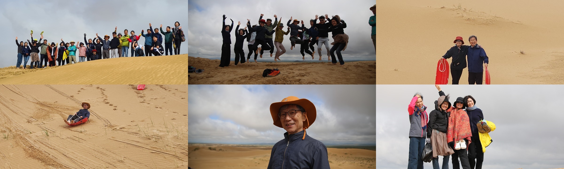 전날 축제의 2차를 4인용 우리 게르에서 하는 바람에 비몽사몽 정신없게 일어났다. 조식 후 숙소에서 버스로 이동한 다음 모래언덕까지 걸어가 썰매를 탔다. 경사가 30-40도, 길이가 100미터 정도 되는 모래언덕이다. 플라스틱 썰매에 등을 붙여 누운 자세로 내려가면 가속도가 붙어 끝까지 내려가기도 하고, 중간에 균형을 잃어 엎어지기도 하며 스릴을 즐긴다. 입으로 모래가 들어와도 어린애들처럼 소리지르며 마냥 신나는 모습이다. TV에서만 보던 사막의 모래썰매를 체험할 수 있어 좋았다. 우리는 바람이 불어오는 모래언덕에서 맨발로 걷고, 팔짝 뛰면서 사진도 찍으며 사막을 즐겼다.