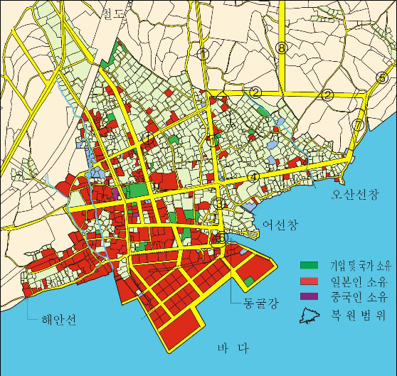 동성(東城), 중성(中城), 서성(西城), 오산(午山), 성산(城山), 성호(城湖)의 여섯 동네로 이루어진 마산포는 대정 2년(1913)의 임시토지조사 때 모토마치(元町) 도미마치(富町) 사이와이마치(幸町) 고토부키마치(壽町), 이시마치(石町), 다와라마치(俵町), 요로즈마치(萬町), 신마치(新町)란 여덟 동네로 개정되고 오동(午東), 상남(上南), 성호(城湖), 자산(玆山)의 네 개 동이 여기에 연접하고 있다.