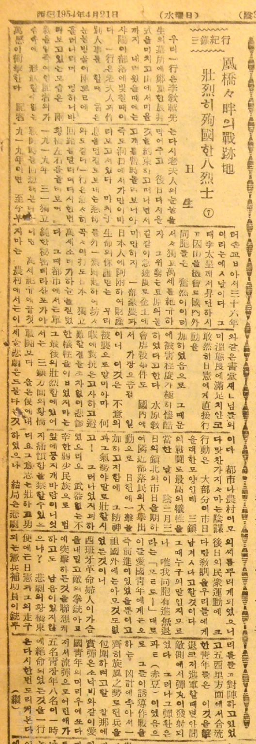 그때 누구의 말인지 모르나 유아동포 유진무태(唯我同胞 有進無退) 라는 「모토」대로 이를 애국청년에게는 오직 전진이 있었을 뿐이고 조국 외에는 아무 것도 없었든 것이니 서반아(西班牙)혁명 때 부인(婦人)이 가슴을 내밀고 적의 권총 앞에 돌격하던 것을 연상케 하고도 남음이 있지 않으냐?