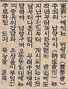 오동동 야시장1 그림으로 보는 마산도시변천사 (188) - 강점제3시기 도시와 관련한 두 가지 기사입니다. 10. 1938년 7월 21일자 매일신보 6면입니다. 기사의 제목은 「馬山午東洞에 夜市」이며 기사는 「마산부 오동동에 있는 번영회 주최의 납양야시(納凉夜市)는 작년부터 개시 하였던 바 금년에도 지난 17일부터 개시되었는데 첫 날부터 나온 사람이 무려 수천 명에 달하여 납량구역 오동동 일대에는 미증유의 잡담과 은성을 이루었고 주로 과일 도시 목공물 포목 십전균일품 등으로 또 값도 싸므로 성적이 양호하다고 한다」입니다. 1937년부터 개장된 오동동 야시장이야기인데 당시 오동동 모습을 짐작하게 해주는 기사입니다. 기사 중 납양야시(納凉夜市)는 '여름철 더위를 피해 시원한 밤에 열리는 시장'으로 이해할 수 있겠고, ‘은성을 이루었고…’는 요즈음 잘 사용하지 않는 언어로 ‘번화.. 2013. 11. 18. 이전 1 다음